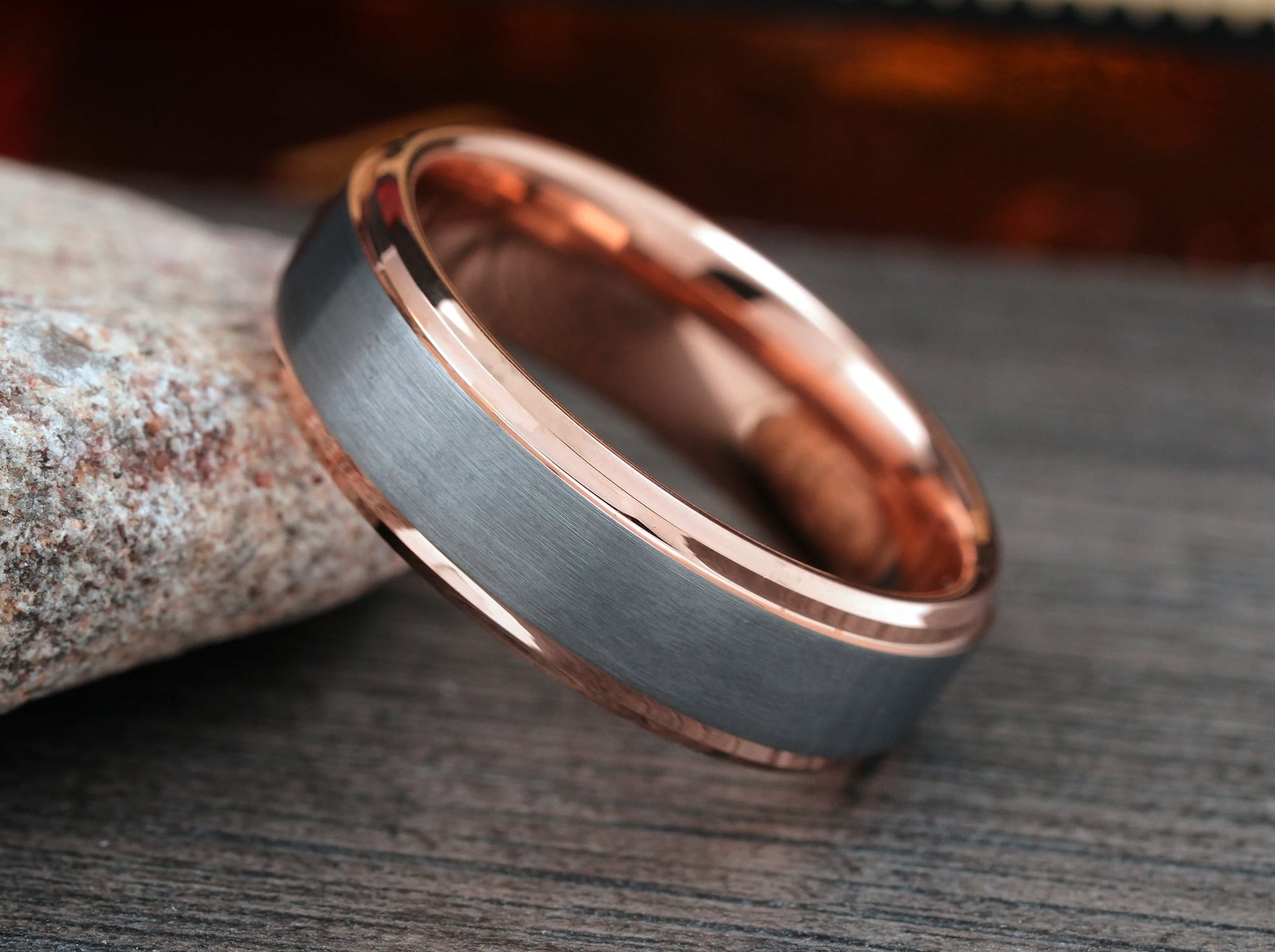 Current Processing Time:Brushed tungsten wedding band with rose gold stepped edges. The inside is rose gold ion plated all the way to the stepped edges. The center is a brushed finish.