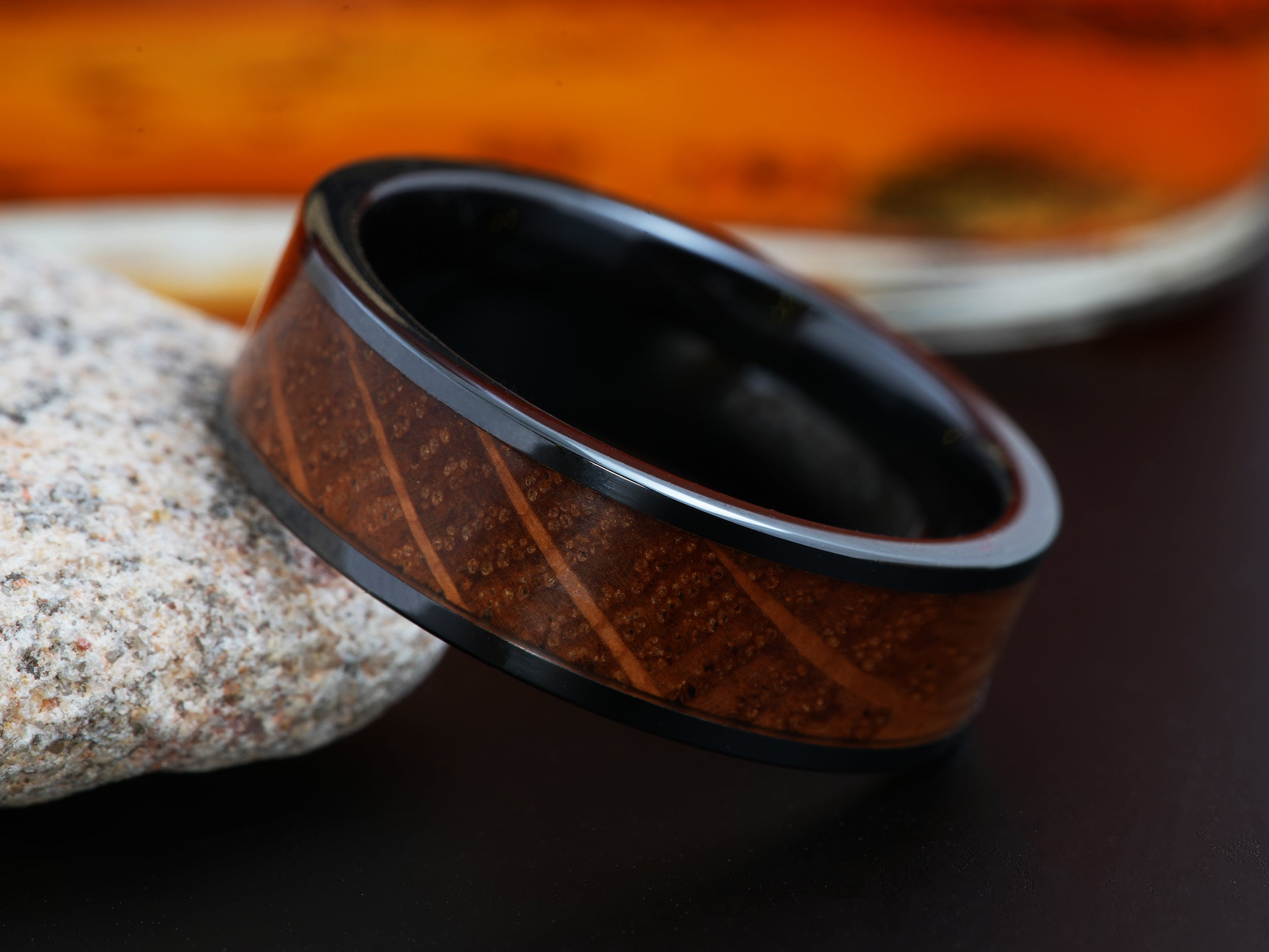 Current Processing Time:Solid black ceramic shell with weather whiskey barrel wood inlay. The wood is sealed with a protective epoxy layer to prevent moisture from getting in. This ring is non-conductive, so it's safer for electricians to wear.