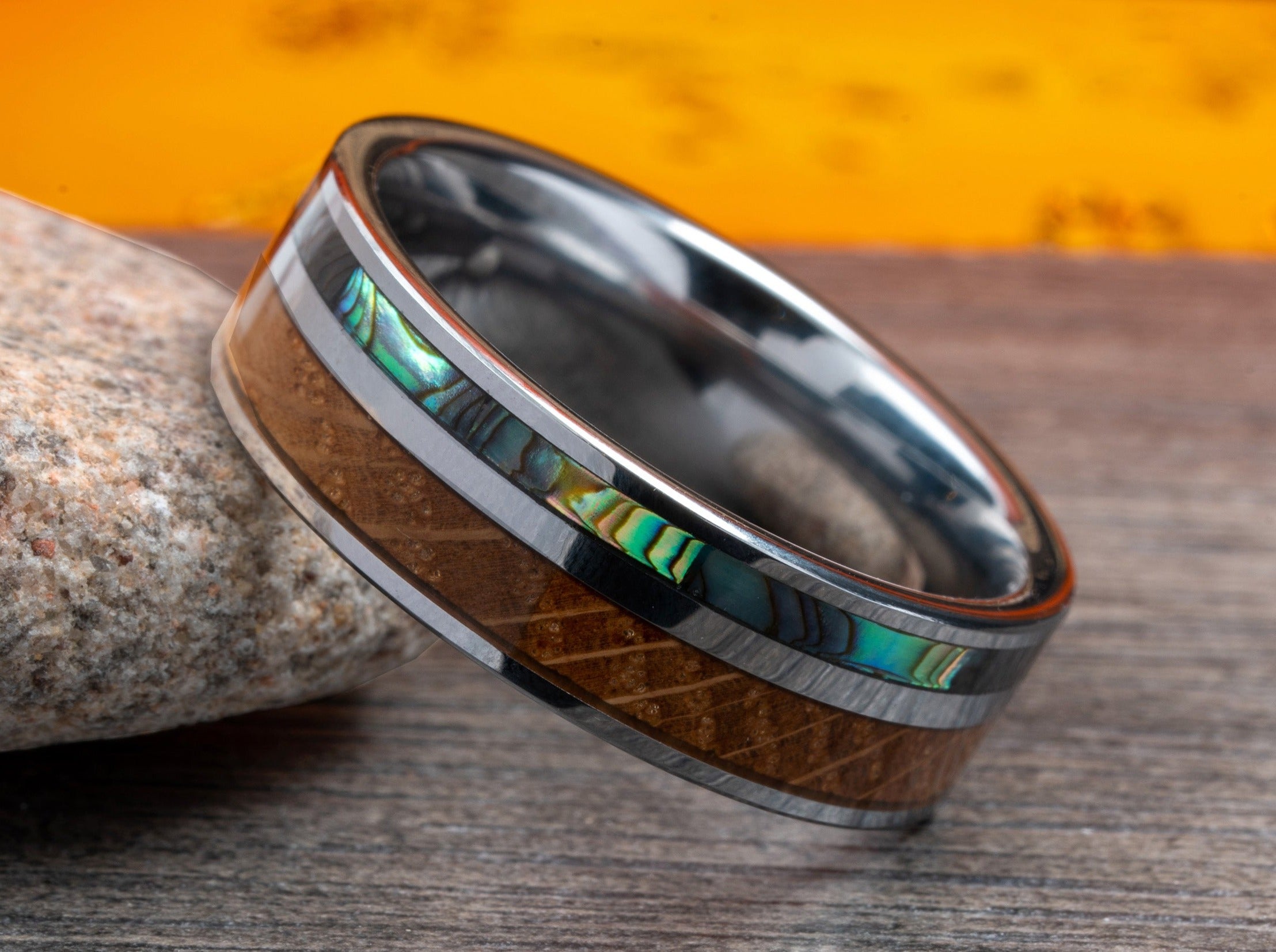 Current Processing Time:Mens wedding band made of tungsten carbide, Tennessee bourbon barrel wood, and abalone seashell. Tungsten carbide is highly scratch resistance second only to diamond. The wood and sea shell have gone thru multiple steps of sealants for a shiny and water proof finish.