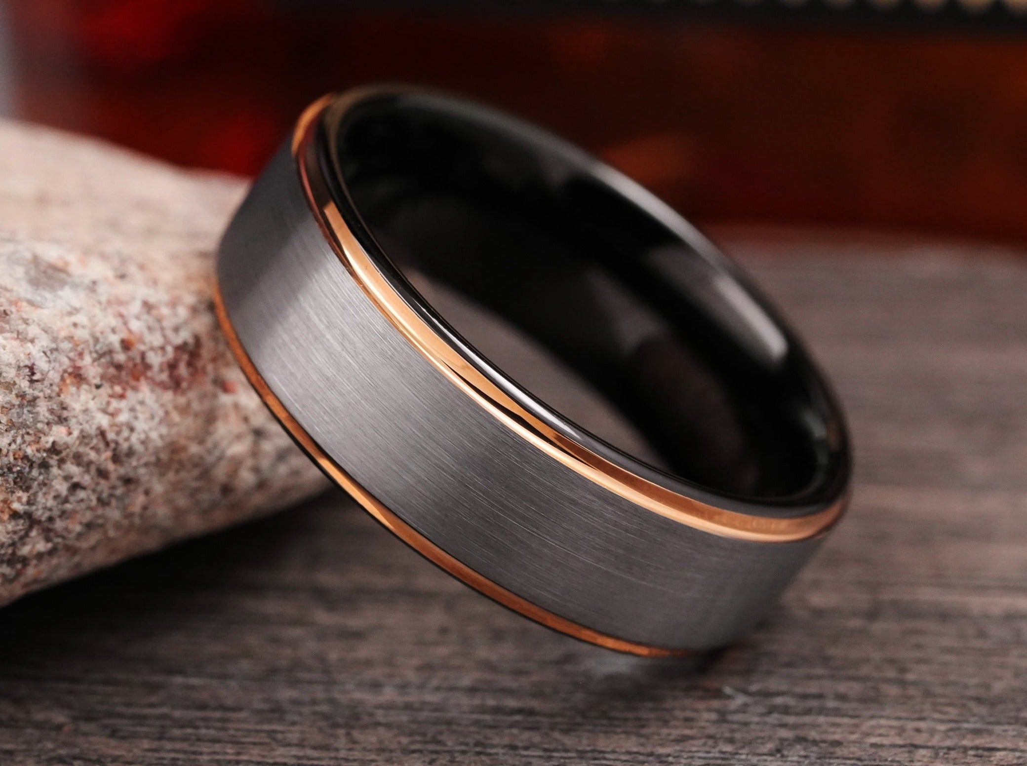 Current Processing Time:Brushed tungsten wedding band with rose gold stepped edges. The inside is black ion plated all the way to the edge. The center is a brushed finish for a classic look.