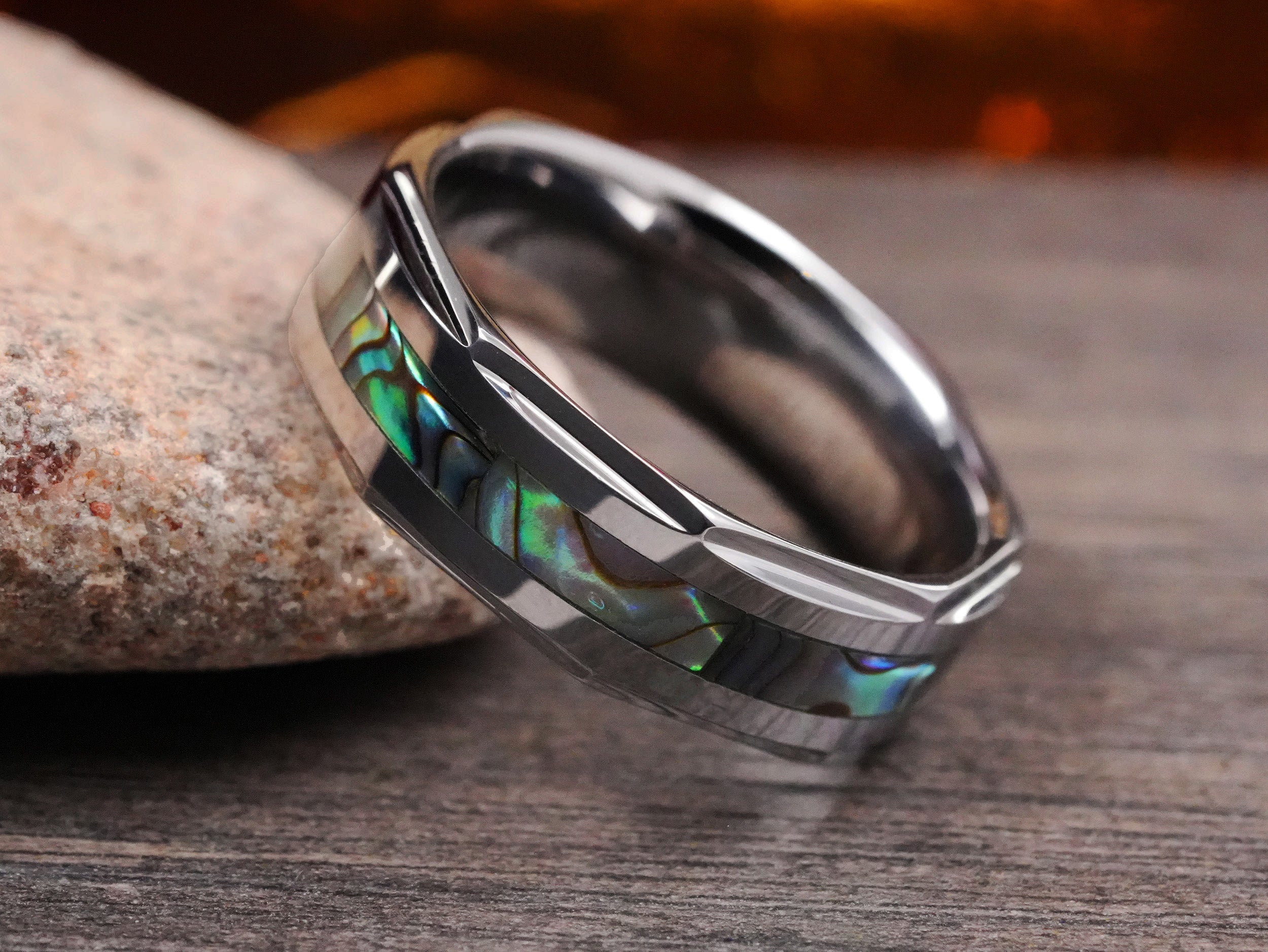 Current Processing Time:Mens wedding band made with tungsten carbide and abalone seashell. The edge is cut into a smooth 8 side (octagon shape). The center of the ring features abalone inlay. This is a very unique design with exotic material.