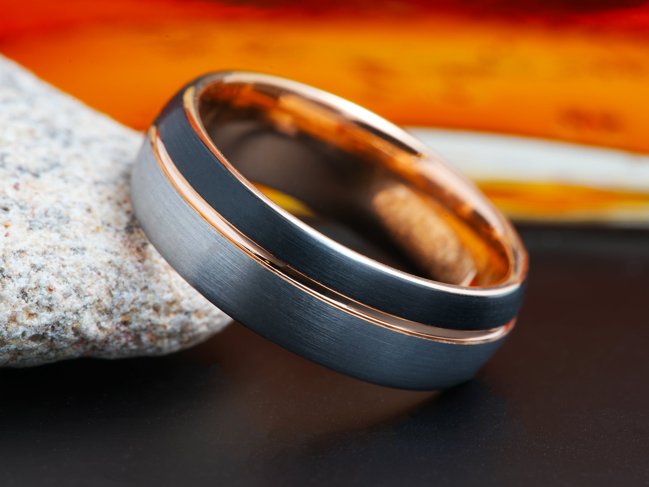 Current Processing Time:Domed tungsten ring with one side plated black and one side brushed separated by a rose gold groove. The inside is rose gold ion plated all the way to the edge. The domed face is a brushed finish for a classic look.